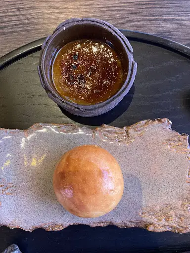Following the sushi came a Hokkaido milk bun, fluffy and warm, evocative of what you can find in a bakery in the northernmost main island of Japan. The warm bun was accompanied by a mushroom custard, served akin to a creme brulee. We could see chefs in the open kitchen using blowtorches on a dish, wondering what would come from it, only to flip over the dish the bun was served on to find the mushroom custard.