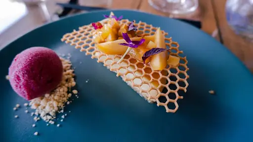 Next was a sweetiepie and raspberry sorbet. Topped with fresh fruit and a biscuit lattice, the plating may have been one of the prettiest of this entire meal. The sorbet was atop a light crumble, which added a complementary crunch to the ice cream, similar to the lattice on top of the cake.